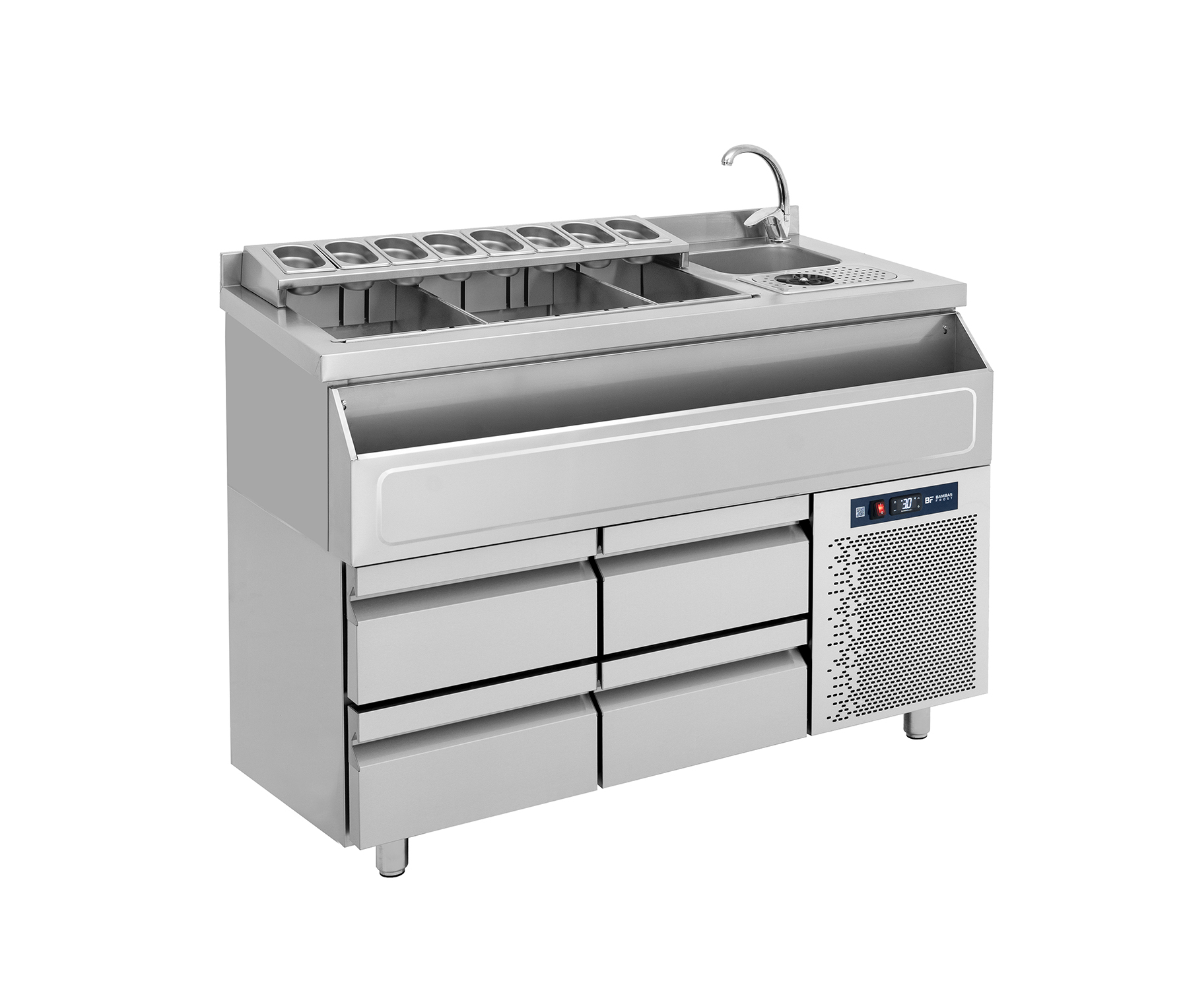 Ein Kühltisch in einer Cocktailbar ist ein spezieller Tisch, der mit einer Kühltechnik ausgestattet ist, um Getränke und Zutaten für Cocktails kühl zu halten. Meistens handelt es sich um einen länglichen Tisch mit einer eingebauten Kühlfläche, auf der Flaschen, Eis, Fruchtsäfte oder andere Zutaten aufbewahrt werden. Der Kühltisch sorgt dafür, dass die Zutaten während des Arbeitsprozesses frisch und gut temperiert bleiben, was vor allem in einer Bar von großer Bedeutung ist, um qualitativ hochwertige Cocktails zuzubereiten.