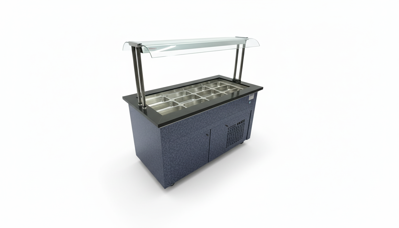 Das Kalt-Buffet „Hamburg“ ist eine hochwertige, leistungsstarke Lösung für die professionelle Speisenkühlung in Gastronomie, Hotellerie, Systemgastronomie und Catering. Die robuste Edelstahlwanne bietet optimale Hygiene und Langlebigkeit, während der integrierte Motor im unteren Bereich für eine kompakte, platzsparende Installation sorgt.