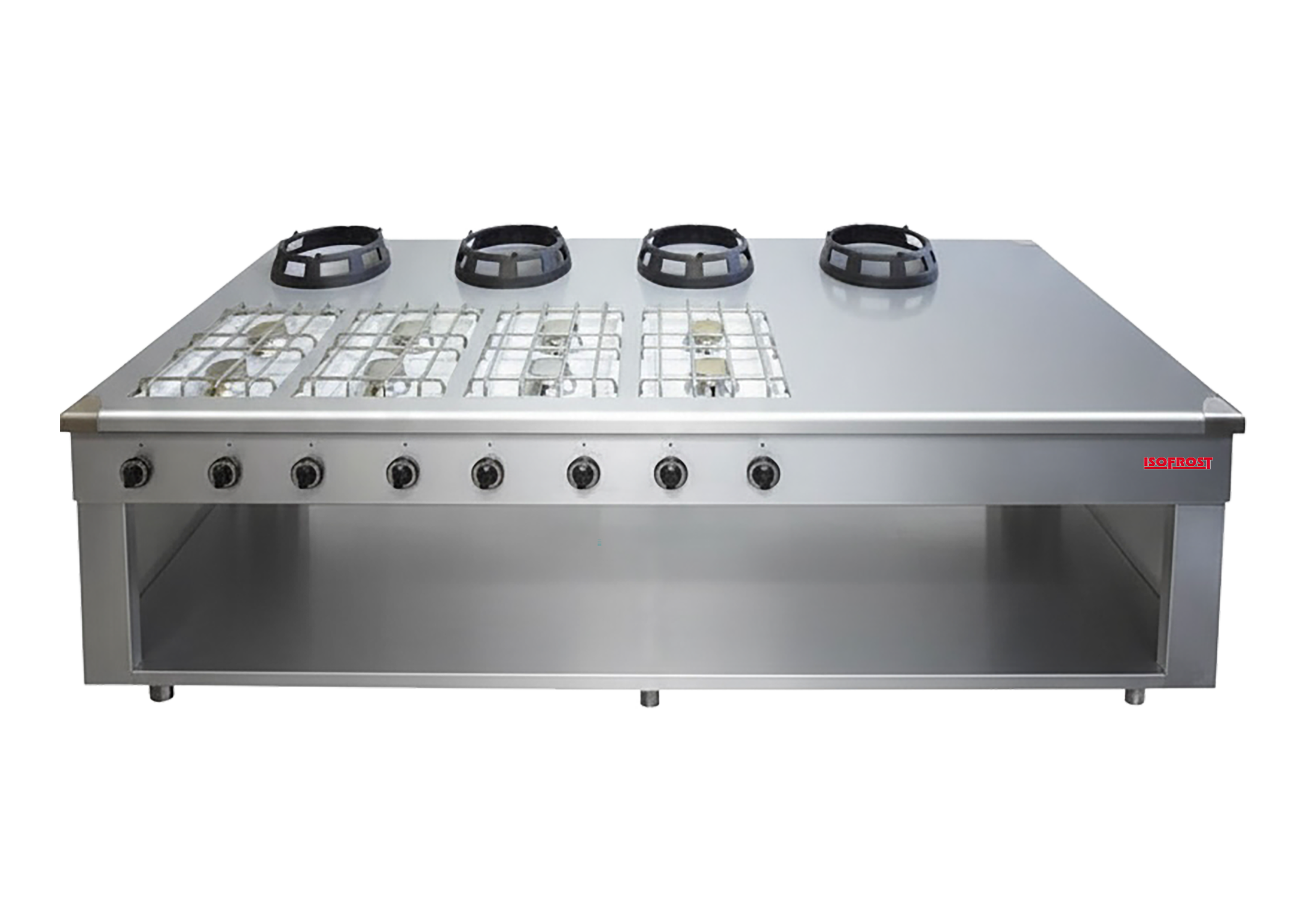 Die robuste Rahmenkonstruktion aus Edelstahl CNS sorgt für hohe Stabilität und hygienische Reinigung. Der offene Unterbau mit getrenntem Gestell und Grundboden bietet zusätzlichen Stauraum und erleichtert Service- und Reinigungsarbeiten. Die einteilige Herdabdeckung sowie Brennermulden mit Fettauffangschalen gewährleisten sauberes Arbeiten auch im Dauerbetrieb.